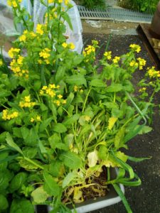 庭土が大分雨水を吸っています。さてさて、水が退けるのはいつ頃かなぁ。今日は一畝の小松菜と高菜を収穫します。サッと湯がいて冷凍して置きましょう。