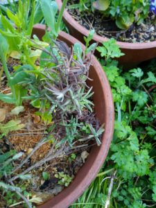 左: 草が生え、放って置いた鉢でムスカリが生き延びていた!?