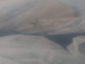直径7㎝の紙カップに植えられた紅花インゲンは既に蔓を出していました。二重にした農ポリの中は想像以上に暖かくて蠅の様な虫が入っていました。温度に敏感ですね。