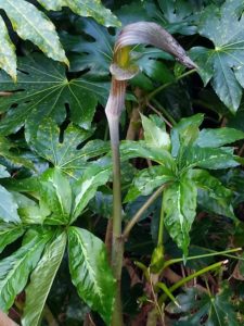 右: カイヅカイブキで暗くて湿っていたからじゃないかな。マムシクサが生えました。一昨年からです。全草有毒です。