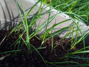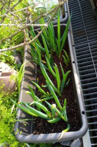 左: 芍薬が25㎝位に伸びました。中&右: 落ちこぼれ葱さんと再生葱さんに土を入れました。
