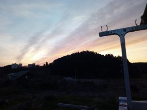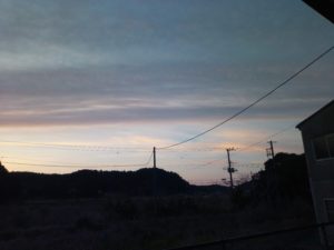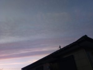これは日が沈む時間になって、わぁ!西の山に太陽が差し掛かっているじゃない!?、と驚いた時なんですが、その後日が暮れ始めた時に、煙の様な変な雲とその北側にエネルギーを感じさせる雲がびっしり並んでいるのを見て、スマホを持って飛び出しました。写真は17時10分撮影です。この時も西の山に直線的な雲が見えますが、私は意識していませんでした。