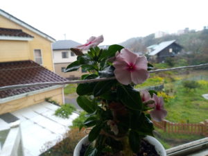最近は廊下の嵌め殺し窓に夜も居るニチニチソウ先生は花を5つ、終わった花が2つ、今にも咲きそうな蕾が2つ着いています。とうとう冬越しを完了しましたね。後もう少しの辛抱です。