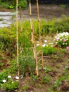 中: 蚕豆は小さいけれど、これでも八段目まで花が着きました。