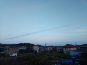 自衛隊ジェットの飛行機雲?東南東から半島に入り、西南西へ向かっています。