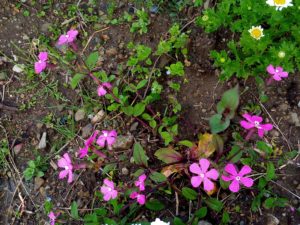 ピンクの花の生長が著しいこと!Wさんから頂いた時は2つの花が着いていただけでしたが、12個位着いていますよね。花色のショッキングピンクはアクセントになる色ですので、白いノースポールと黄色のジュリアンの花壇を楽しいものにしてくれています。