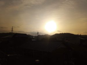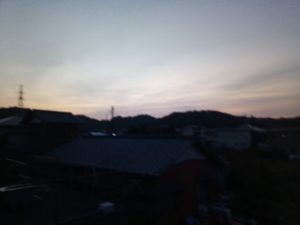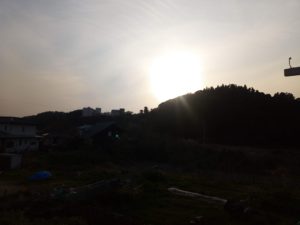 中: 夕日が西の山の端から差しています。