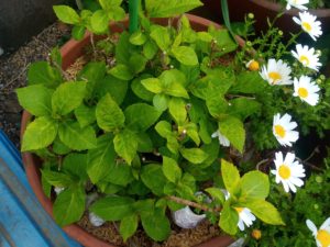 左: 玄関前の紫陽花。中: 玄関アプローチの蕪と小松菜の菜の花。右: 種から育て等かすみ草。