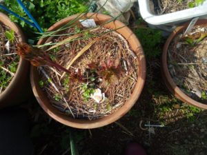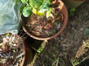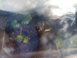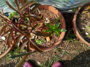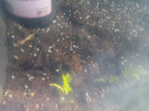 左: 催芽してwinter-sowingボトルで育てた人参向陽を定植したのは物干し下のプランターで、