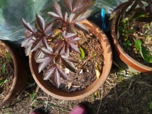 芍薬7鉢です。腕を伸ばした状態で撮りました。株の生長によって葉の茂り具合が違います。