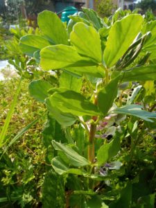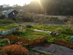 西隣さんの庭です。花壇、蚕豆、玉葱、緑の絨毯!。お借りする畝に余った人参の種を蒔き上から刈草を掛けて来ました。畝を借りた時に乗せたゴミの中に南瓜の種が入っていたようで、いくつか出ていました。