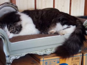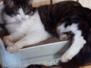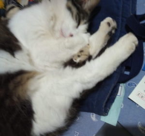 福が眠りこけて居たので、写真を撮ろうとしたら氣付かれてしまいました(笑)。トラ子は耳を確り私の方に向けて居ます。高感度アンテナです。ひそひそ話の容量で『ト・ラ・チャン!』、とささやくと耳アンテナがグイッと此方を向きます。いつの間にかうめも帰って居ました。