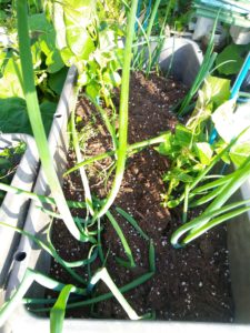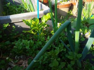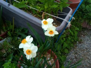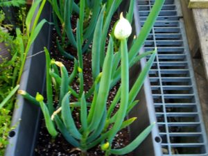 左: 此方は再生葱のプランターです。現在薹立ちが4-5本見られます。今年は種を採って蒔きますよ~。
