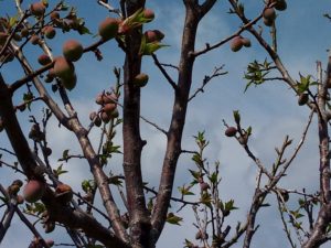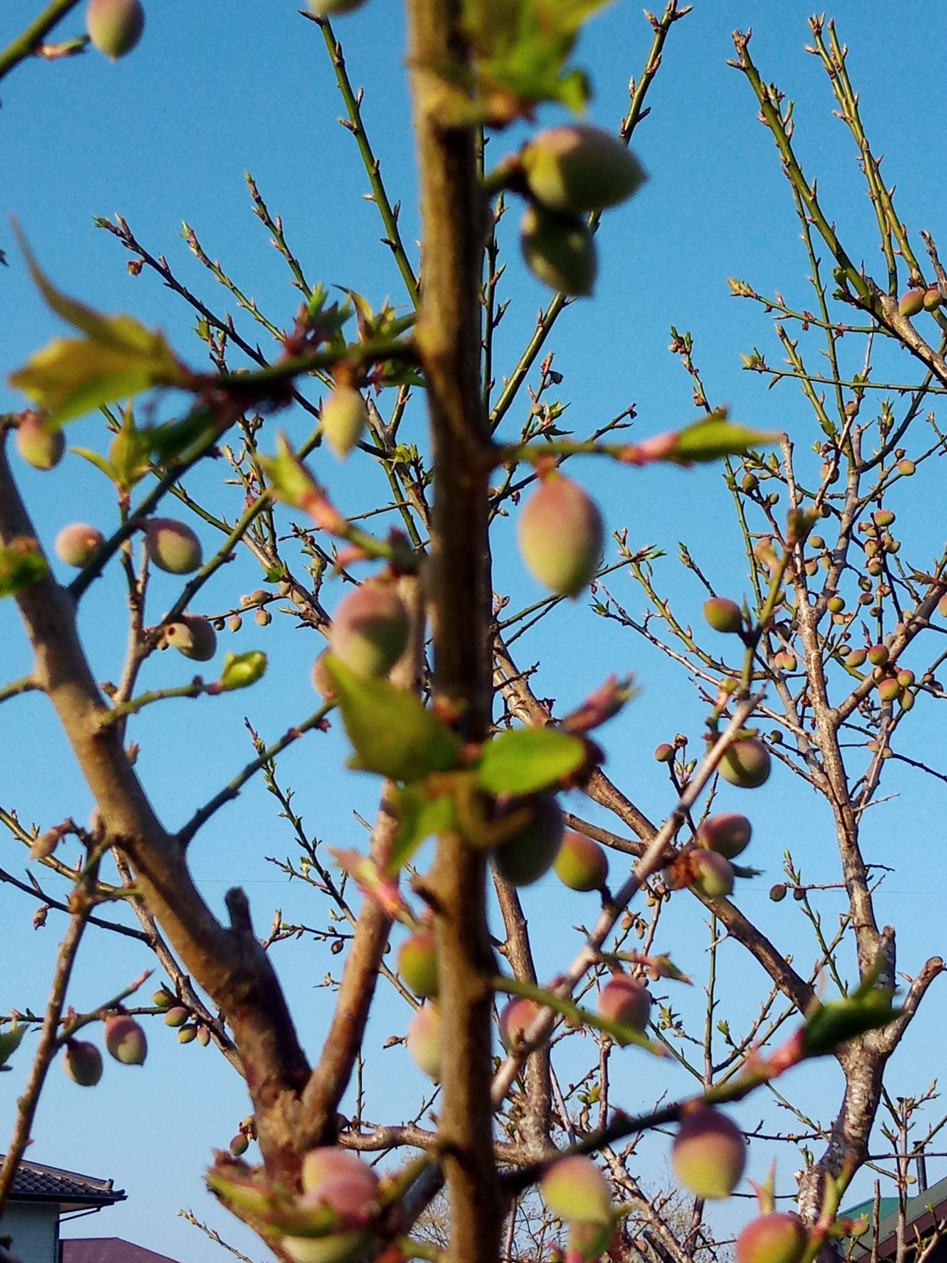 梅が3日前の雨を吸収して急激に膨らみ、若葉迄が覗いています