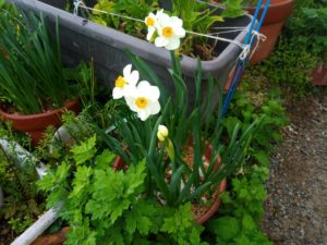 右: 玄関前の水仙に新しい蕾が上がりました。下段左: こちらは小さな紫蘇の発芽。