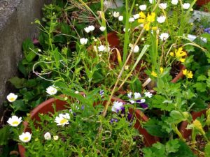 右: かすみ草にノースポールに小松菜の菜の花です。