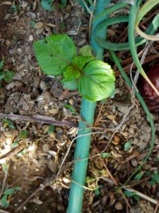 右: 脇の通路の大鉢は葱と共存です。朝顔支柱の輪っかを一つ増やしました。ニジュウヤホシの食害が出る時季なので、垂直仕立て栽培を実践しています。小さな虫ですが、被害は馬鹿になりません。