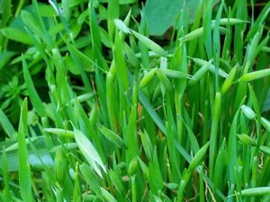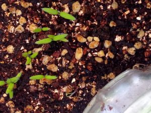 左: 高菜も花を上げようとしています。中: ミニトマトが発芽しました。右: 猫草(燕麦)が花をあげて来ました。