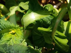 左: キャベツに虫食い跡を発見。これがトンネルのダメな処ですね。注意喚起が鈍くなります。