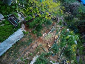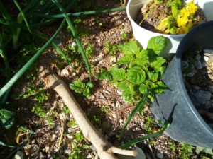 右: ここに植えたジャガイモが発芽して来ました。