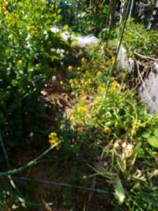 夕方西隣さんの蚕豆の間の草(スギナ)が物凄い事になっているので鋸鎌で刈り取ってその場所に置いて置きました。見た時はうへぇ!、と思いましたが、取り掛かってみると案外簡単に行ったので、勢いが付いた処で花壇内の中心の部分の草を刈り取りました。本当は掘り返して根を掘り上げるのが最善策ですが、それは物を植える度にして行く事にして、取り敢えず地上部の光合成をなくす事が先決です。