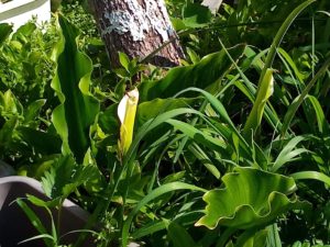 右: 柿の木の下のカラーに第一花が上がりました。現在二本でています。