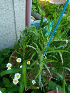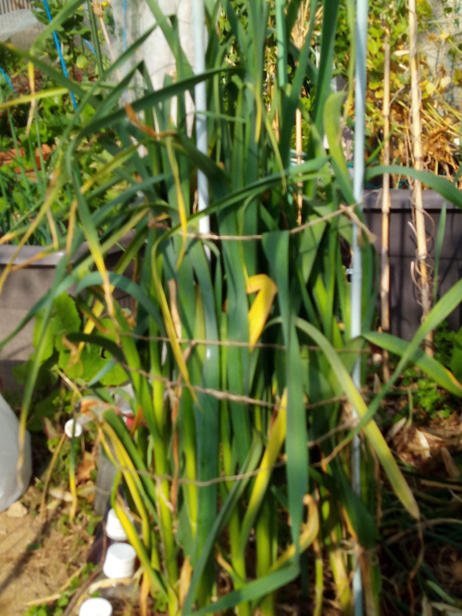 狭い庭で、大蒜の種が多過ぎてまとめて植えたのが、此処へ来て、これは!?、と閃くものがありました。まとめたら、垂直仕立ては楽じゃない?