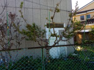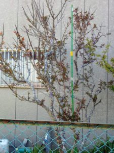 左: 実梅は立ち枝がありませんので、今出ている小さな芽を伸ばして立ち枝を作ります。これが今年の梅仕事の第一です。中: 鹿児島紅にもようやく銅葉色の新芽が出て来ました。