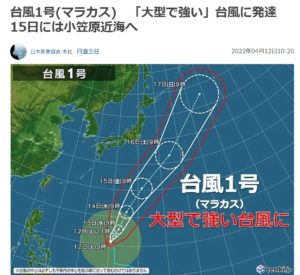 14日間天気予報では14日(木)から雨が降り出し、16日(土)は晴れる事から、台風1号マラカスの進路がある程度、日本から距離をとって通過して行くような予想が為されて居るようです。あくまでも平均的な数値ですが、15日(金)に雨が上がった後に8mの北寄りの風が吹きます。昨日の予想みたいな強風にはなりません。勿論、大自然の生き物ですから、”想定外”は常に在り得ます。他に雨マークは18日の夜または19日未明に小さな傘マークが付いているおみです。