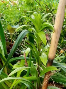 左: 鉄砲ユリ。この後紐を結び直しました。雨が降った後の生長は物凄いです。
