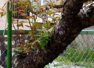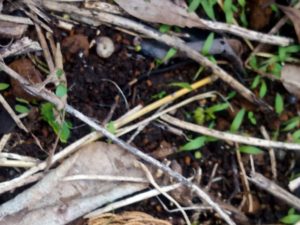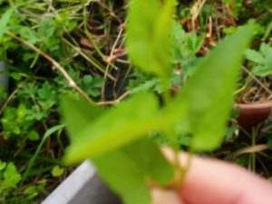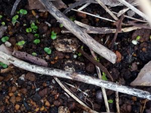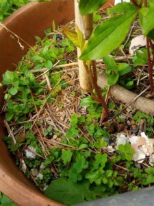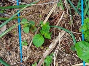 右: 名前は知らないけれど、今、この草が発芽しています。つる草で細いけれど確り絡みつきます。