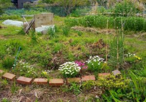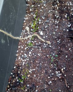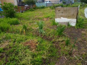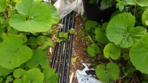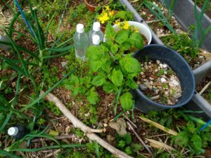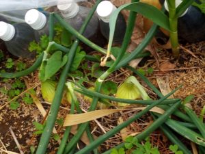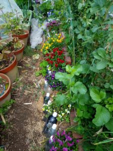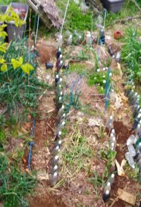 畝の反対側に土留めのボトルが無い処へ不要になったボトルを並べました。最終的には作物が土留めになって呉れるのが一番です。