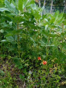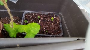お隣の小父ちゃんの畑では豆が、多分紅花インゲン、が発芽していました。凄いなぁ。