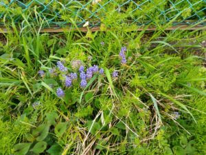 右: ムスカリはかなり頑張っていますが、やはり草には負けますよ。我が家では鉢植えで負けそうになりましたので、大慌てで土を入れ替えました。球根は辛うじて残っていましたので、植え替えました。