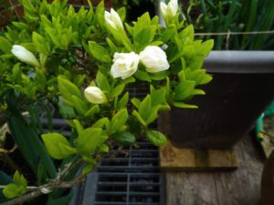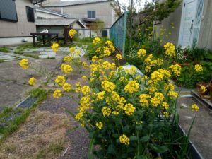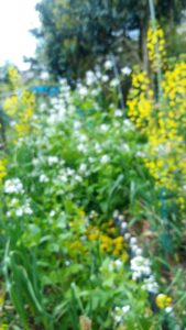 左: 白躑躅。中: かすみ草。右: 小松菜の菜の花は傍を通る度に甘い良い匂いが漂います。