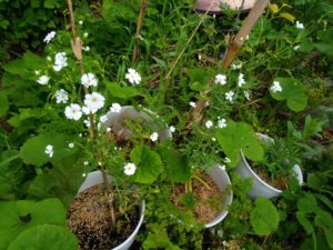 左&中: 先に発芽して鉢から持って来た株は丸くなって咲きますね。