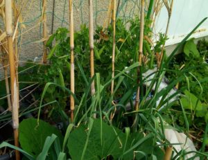 左: 脇の通路に蕗が生えまくっています。これも食べないと。中: 草が大蒜のど真ん中で絡みついて伸びて40-50㎝の背丈になりました。右: 大根の花が他の植物に寄り掛かって風通しが悪くなっています。