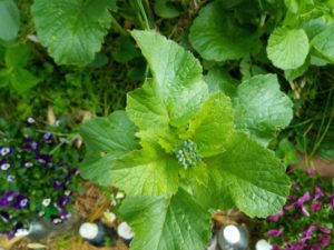左: ビオラが満開ですが、案外、色が後退しますね。中: ラディッシュの花芽です。右: ジベレリン、エタノール等は下から上がって来る時に下の方から影響を与えて行きますね。この真ん中の枝には未だホルモンが上がって来ない様ですね。一番古い枝かも知れません。