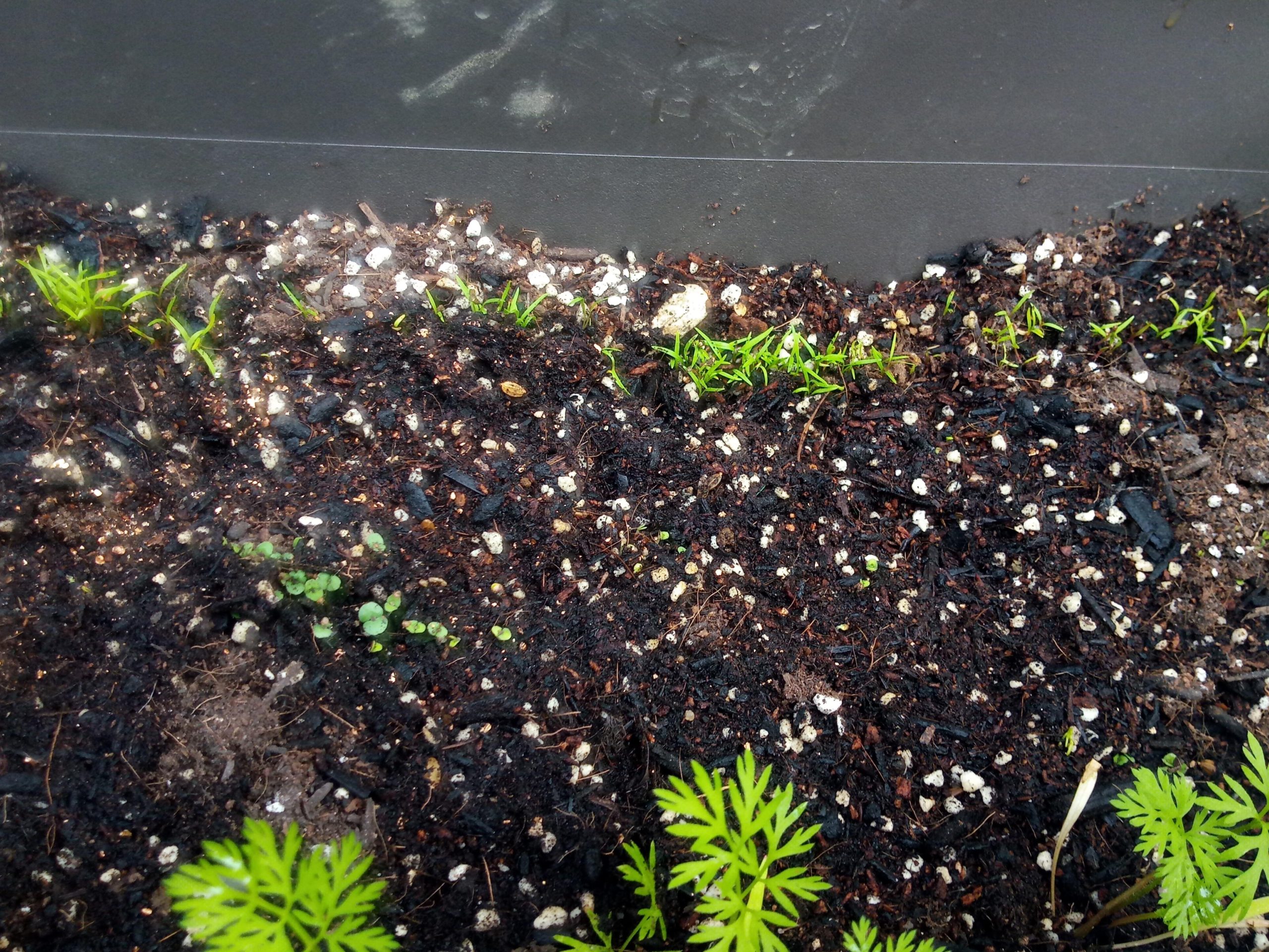 同じプランターではピッコロ人参も発芽しています。庭ではシソ科の植物が発芽しているので、園芸書が推奨するよりはずっと早く播種しました。