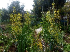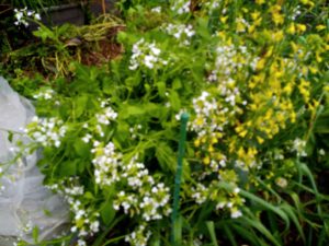 左: 今日、大根の花を整理します。風通しが悪くなって仕舞う。1-2畝間通路ですが、通れません(笑)。