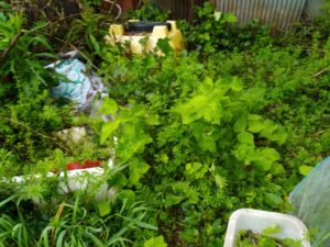 右: 南側のプランターにはイネ科の草に混じって赤紫蘇が発芽しています。。