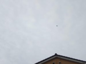 右: 屋根の真上にポツンとあるのは旅客機です。今日はこの町の上を飛んでいました。