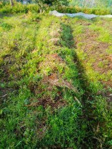 通路が刈草で緑色になったから、今日はこれで終了。夜は雨ですよね。金曜日に乾かして一か月以上してから畝に上げます。