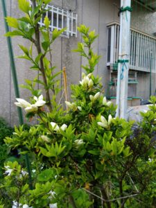 白躑躅。垂直仕立て栽培に偶然なった枝の花は大きいです。
