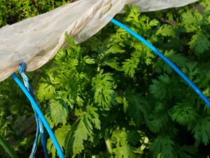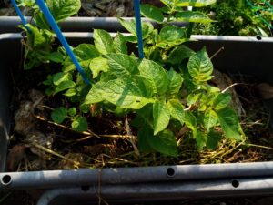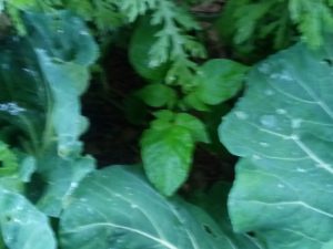 キャベツの間から見えるのはジャガイモです。現在の処、キャベツの外葉で陽が当たらず春菊との僅かな隙間に顔を出して来ました。狭くてゴメンよ。11月に植える時にはキャベツも春菊も小さかったので、ギューギュー詰めにしちゃったね。