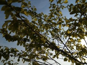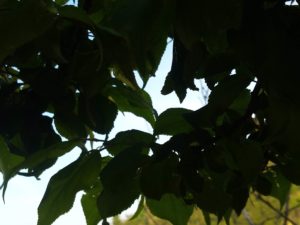 左: 見上げた柿若葉(大西条)。中: 見上げた実梅の新葉。 右: クロッカスの鉢に出た紫蘇。