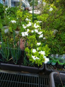 白躑躅。垂直仕立て栽培に偶然なった枝の花は大きいです。