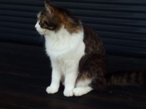 西隣さんでチョキチョキをしていたら、うめが呼びに来ました。『オカアシャン、そろそろワタシ、お腹が空きました~。』、二階へ上がるとトラ子も居て、一緒にカリカリ。あら、福がいない。未だ西隣さんで監督をしているのかな?