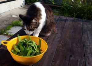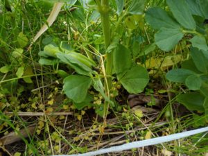 朝の見回りには福とうめが着いて来ました。尤も、最初から西隣さんで日向ぼっこをしていたのですが(笑)。『監督は平とは一緒に動かないんだよ~!』私=平従業員(笑)。絹さやと一部スナップエンドウ。多分平行して列ごとに分けたんだと思うけど、上では絡まって混ざってしまうよ。