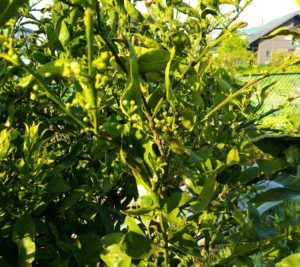西隣さんの庭です。温州さんに沢山花芽が着いていますよ。この間見た時は無かった…否、見えなかった蕾がハッキリして来ましたよ~。